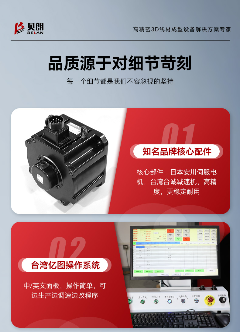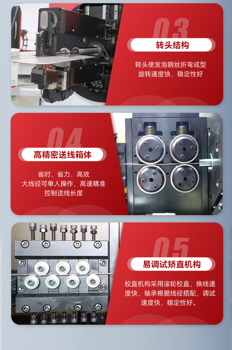 產(chǎn)品特點:調(diào)試和切換產(chǎn)品更方便,無需頻繁更換工裝夾具,成形空間更靈活;產(chǎn)品通過頭部旋轉(zhuǎn)成型產(chǎn)品,可成型100-600mm長鋼絲件及不對稱產(chǎn)品(汽車發(fā)泡鋼絲);頭部旋轉(zhuǎn)設(shè)計根據(jù)產(chǎn)品特定,可靈活高速旋轉(zhuǎn),提高產(chǎn)品生產(chǎn)效率。