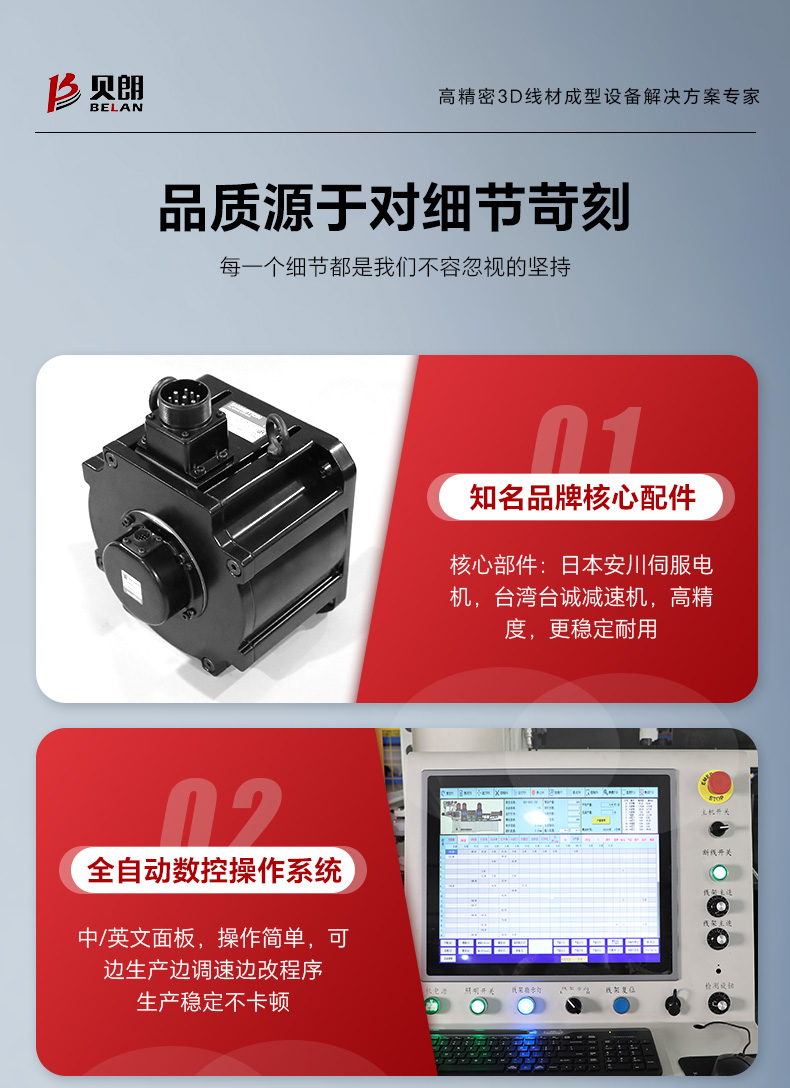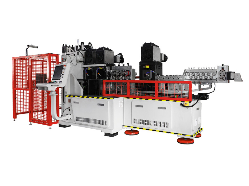 產品特點:折彎采用內外轉同步折彎,可折側彎,立彎,扭彎;切斷模組帶有預壓功能防止切口有毛刺,切口平整;設備自帶壓凸點,沖孔,壓LOGO,修披風(選配);設備自帶輔助送線裝置一人可輕松跟換材料。
